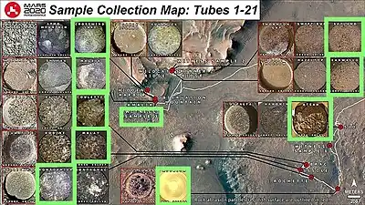 目前在在毅力號攜帶的43個樣本管中,已經封裝15個岩石樣本(8個火成岩樣本、7個沉積岩樣本)、2個表岩屑樣本、1個大氣樣本和3個見證管,而43個樣本管中有5個見證管,會裝入毅力號探索區域周圍的環境中的氣體與微粒,作為樣本的對照組。[43]