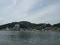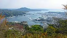從氣仙沼魚市場眺望氣仙沼灣對岸,後方是安波山