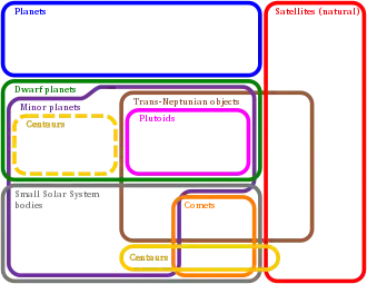 根據它們與太陽的距離和它們的軌道參數,TNO被分為兩大類:古柏帶天體(KBO)和離散盤天體(SDO)[nb 1]。右圖說明已知的海王星外天體(距離遠達70AU)相對於行星軌道和半人馬小行星的分佈,以供參考。不同的類別以不同的顏色表示。共振天體(包括海王星特洛伊)以紅色繪製,傳統古柏帶天體以藍色繪製。離散盤的天體向右延伸,遠遠超出圖,已知天體的平均距離超過500AU(賽德娜)和遠日點超過1,000AU((87269) 2000 OO67)。