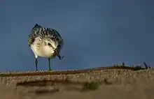一隻三趾鹬(Calidris alba)正在捕食一隻kelp fly