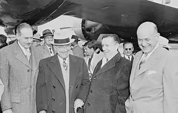 事件核心人物——總統哈里·S·杜鲁门(左二)與國防部長路易斯·亞瑟·詹森(右一)。