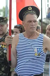 ![]() 一個身穿俄式海魂衫的男子在頓涅茨克的勝利日遊行 | |