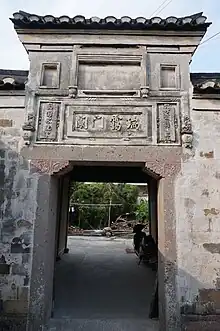 方义房大门,门楣正中刻“瑞霭门阑”,两旁刻“竹韵梅香宅,山园水绕家”,2015年10月