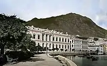1869年的中環海徬,第一代總行的獲多利行是圖中左二之建築物