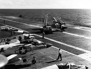 1944年12月15日,漢考克號正在菲律賓海作戰。此時雷伊泰灣海戰已經結束,艦隊正空襲菲律賓各地,以支援重奪菲律賓的美軍部隊。相中可見漢考克號的前部飛行甲板遭切割縮短,使剪型艦艏上的防空炮可更有效射擊。只有漢考克號與提康德羅加號有切割飛行甲板。由於縮短飛行甲板令飛行作業倍添危險,兩艦在不同時間將甲板復建。