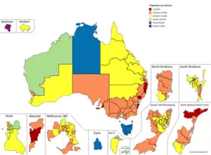 澳大利亞聯邦下議院乃由151個選舉分區所各別選舉出的議員所組成;各選區當選名額為1席,英語稱以Divisions,或稱electorates、seats亦可。英國西敏寺的常用詞「constituencies」於澳大利亞相關法律中則不常見。