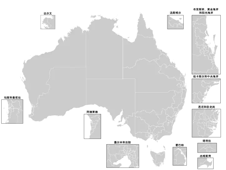 在新南威爾士州有47個分區,在維多利亞州有38個分區,在昆士蘭州有30個分區,在西澳大利亞州有16個分區,在南澳大利亞州有10個分區,在塔斯馬尼亞州有5個分區,在首都地區有3個分區,在北領地有2個分區。