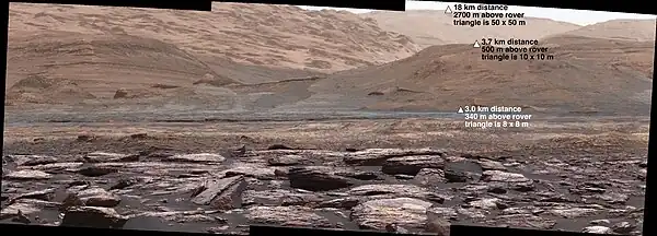 2014年9月11日(第746个火星日),好奇号到达了埃俄利斯山(亦称夏普山)斜坡,这是火星车任务主要的长期目的地[148][149],预计火星车将在那里了解到更多有关火星地质史的信息[108]。自2013年7月4日离开黄刀湾“起点”来,估计好奇号行驶了6.9公里(4.3英里)[150]的直线距离抵达山坡[150]。