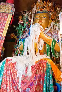 - 佛殿:殿内主供江白多吉(又作“觉阿江白多吉”、“觉阿绛巴多吉”,为阿底峡所依的本尊。“觉阿”意为“尊长”或“至尊”,是对佛祖的敬称;“江白多吉”是密宗无上瑜伽续部密集金刚的别名)。该神像是由金刚持佛父母大智慧明点(“金刚持佛”为释迦牟尼说密法时所现的身相,是密宗的秘密之主;“智慧明点”是指空性光明)所塑造。《卫藏道场胜迹志》记载“凡对此像祈祷叩求,无论何事皆能如愿成就。”此外,殿内还供有十分罕见的偏头的觉阿像,另有白度母像等等。还有赛林巴(金洲大师,10世纪人,曾是阿底峡的老师)、觉阿尊者(即阿底峡)、仲敦巴等的灵骨宝塔。[3][5]