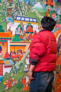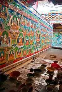 - 经堂:最下面的建筑为大经堂,坐北朝南,为僧众进行佛事活动的主要场所。大经堂周围有若干小经堂。大、小经堂内藏有佛像及经卷。大经堂的墙壁为夹壁,内墙是《甘珠尔》、《丹珠尔》的经架,外墙是石墙。大经堂内到处都是唐卡,其中一张新绘制者为热振寺全盛时期的全景图。[2][5]