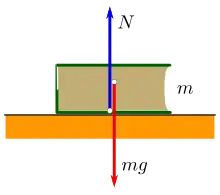 - 上述句子並不符合第三定律的正確含意。這兩道力的本質不同,這兩道力都施加於同一個物體,它們不可能成為作用力-反作用力的力對。設定書本施加於桌子的接觸力 是作用力,則其反作用力是桌子施加於書本的接觸力 ,而且接觸力 等於書的重量 。無論如何,靜止的概念與第三定律毫不相關。事實上,書本重量是由於地球的萬有引力所致,所以反作用力是書本作用於地球的萬有引力,也就是說地球被向上吸引。[17][10]