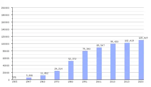 | 自1905年以來人口的變化以及2020年人口的預測。 |