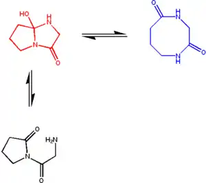 现代术语学的说明是恰当的。经典的Cyclol反应是一个肽基的N-H胺键嵌入另一个基团的C=O羰基;所的化合物现在被称为azacyclol。通过推测,一个羟基基团加入肽基羰基基团后形成一个oxacyclol。同样的,一个硫醇基团加入肽基羰基基团后形成一个thiacyclol [74]。