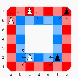 - 兵移至正前或前斜鄰格。移到敵兵初始位時,立即升級為除王、兵以外的其他種己棋。