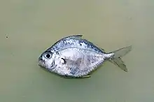 身体呈菱形, 极侧扁。体银白色,侧线鳞为黄色。[2]