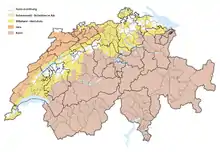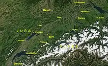 瑞士三大地形区,中部黄色区域为瑞士高原