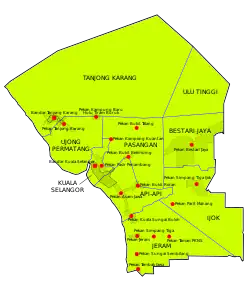 瓜拉雪兰莪县内有2个市(Bandar)及17个镇(Pekan)。[6]