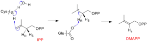 5. 异戊二烯焦磷酸异构为二甲烯丙焦磷酸。酶:异戊二烯焦磷酸异构酶。反应机理:![]() 第五步机理 |
