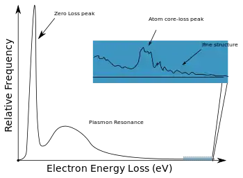 - 高能损失区:和内层电子相互作用导致的吸收边(Core-loss edges)、近边精细结构(Near edge fine structure)和扩展能量损失精细结构(Extended energy loss fine structure)