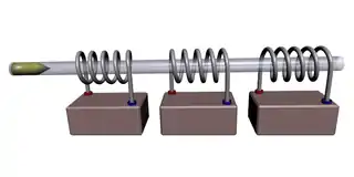 線圈槍的典型範例,三組連接電池的線圈以及一根內有子彈的槍管。
