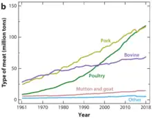 肉類需求的變動將會影響其產量,進而改變畜牧業對環境的影響。估計全球從2000年到2050年期間的肉類消費量將會增加一倍,主要是由於世界人口不斷增加,但也有部分原因是人均肉類消費量增加(增長中的大部分發生在開發中國家)[37]預計全球人口到2050年將增至90億,而預計肉類產量將增加40%。[38]全球家禽肉類產量和消費量在近年以每年5%以上的速度成長。[37]隨著人們和國家更加富裕,肉類消費通常就會增加。[39]畜牧業中不同區塊的成長趨勢也各不相同。例如全球人均豬肉消費量近年有所增加(幾乎完全源自中國國內消費量的增加),而全球人均反芻動物肉類消費量卻在下降。[37]