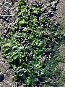 | 在美國加利福尼亞州埃爾克霍恩泥沼的泥灘上生長的海萵苣(Ulva lactuca)上行走的瘦海蜷。 | |