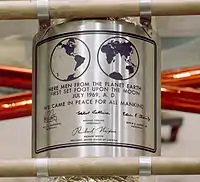 - 为了配合登月舱支撑架的圆形,也为了不影响宇航员进出登月舱,各块纪念牌都被弯曲。最终各块纪念牌都被直接附在梯子从下数起第三级和第四级横档之间。