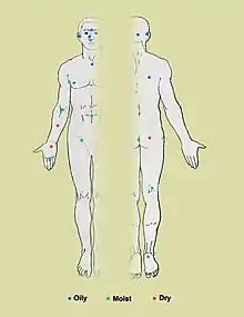 皮肤有三个主要的生态区:皮脂腺、湿润和干燥。丙酸杆菌和葡萄球菌是皮脂腺区的主要菌种。在身体潮湿的地方,棒状杆菌和葡萄球菌占主导地位。而在身体干燥的地方存在多种物种,但β-变形菌和黄杆菌占主导地位。在生态学上,皮脂腺区域的物种丰富度高于潮湿和干燥区域。人与人之间物种相似度最低的区域是手指间隙、脚趾间隙、腋窝和脐带残端。而最相似的是鼻孔旁边、鼻孔内部和背部。[1]
