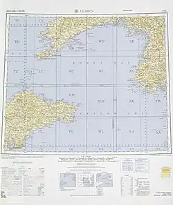 ![]() 黄海海域地形图,盘城列岛位于图中XD区域。地圖的左下角是中国的山東半島。 | |