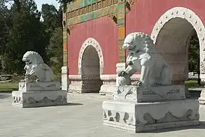 上面的所述的情况是带有普遍性的,但是也有一些例外的情况。例如嘉峪关内侧关帝庙前的石狮子,曲阜孔府前面的石狮子,鼓楼内东华门大街南北两侧的石狮子。这些狮子的造型就比较特别,爪下没有绣球和幼狮,难以区分雌雄。另外,泰山上“孔子登临处”的四柱三门坊前后两面的两对石狮子,却是左雌右雄,与通常的情况正好相反,其中的意义则不得而知。