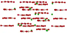 β型晶体结构,接近垂直C轴的视角。颜色:绿色-钡,粉红色-硼,红色-氧