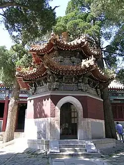 - 乾隆御制重修碧云寺碑亭:建于清朝乾隆十四年(1749年),重檐八角攒尖顶,顶覆黄琉璃瓦,上下檐饰斗拱,红墙红柱,二龙戏珠彩画。亭内为乾隆御制重修碧云寺碑文,碑身两侧雕刻缠枝莲纹,中央是乾隆帝用满、汉文书写的《御制重修碧云寺碑文》,记述了碧云寺历史沿革及规模,碑身下有龟趺海墁。碑亭前的御路上有一块陛石,装饰图案以凤为主,有鹤、蝙蝠等图案,但无龙。