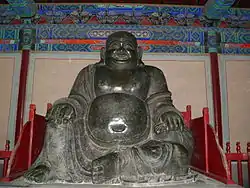 - 弥勒殿(天王殿):建于明朝,面阔三间,单檐歇山顶,柱子未包入墙中。殿内正中供奉铜制弥勒佛,高2.5米,采用五代时期布袋和尚的造型,为明代造像。原来殿内两侧有四大天王像,毁于北洋政府时期。