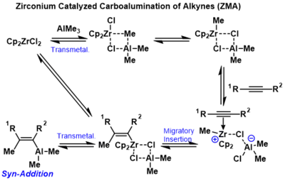 碳鋁化反應最通常被二氯二茂锆(或相關催化劑)催化。某些碳鋁化是被用二氯二茂钛複合物進行的[1] 。該反應有時稱為烯烴的Zr催化不對稱碳鋁化(ZACA)或炔烴的Zr催化甲基鋁化(ZMA)[2] 。