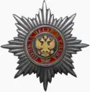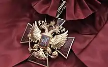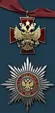 • 带剑勋章:带剑勋章授予军人,主体与一级勋章相同,上方连接小环的部位为两柄十字交叉的镀金宝剑。每柄剑长28毫米,宽3毫米。[6]
