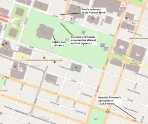 1975年9月5日上午,弗洛姆穿着鲜艳的红色外套[註 5],将柯尔特.45半自动手枪藏于左腿皮套。 [21]准备过后,她从居所前往加州议会公园附近埋伏以等待时机。[5][6][7] 据當日萨克拉门托天气预报称,当天天气温和,平均温度为84°F(29°C)。[30] 在上午9点26分左右,福特结束了萨克拉门托东道主早餐会两个小时行程,回到位于L街1121号的参议员酒店稍作小憩。[31]在上午10点02分,福特从参议院酒店前往加州议会大厦,当他穿过林肯街时,与聚集在小路旁等候的市民们握手交谈。[32][31][33]
