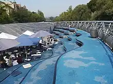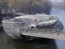 穆尔岛形如巨大的贝壳,长达47米。有两座人行桥通往穆尔河的两岸。平台的中心形成一个圆形剧场。在扭曲的圆顶下面有一个咖啡馆和一个操场[1]。