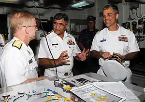 ![]() 2013年,桑迪拉海軍上將(中)在美國海軍航母上參觀。 | |