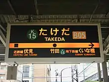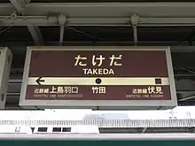 站名牌。近鐵側的月台,但混合管理車站的京都市交設計。相鄰車站也顯示作「近鐵線」