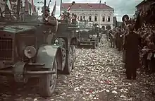 民眾熱烈歡迎匈牙利軍隊進入特爾古-塞奎斯並向他們丟鮮花