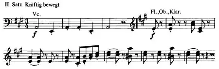 第三乐章葬礼进行曲从第三小节开始由低音提琴演奏一段民歌主题《雅克弟兄》的变体。这种使用低音提琴的手法在交响作品中比较罕见。马勒将这个民歌旋律从大调改为小调,因而使其具有葬礼进行曲的特性。