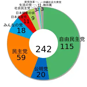 根据计票结果显示,各参选政党所获得的议席为:自由民主党65席,民主党17席;公明党11席;日本维新会8席;众人之党8席;日本共产党8席;社民党1席;冲绳社会大众党1席;无党派人士2席;生活党、绿之风等则未能赢得任何议席。