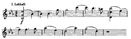 拍子記譜也格外帶來歡欣之感。此外,主要主題竟與史特勞斯的《酒、女人與歌》頗為神似。十六個小節之後,則是另一個更為輕盈的主題。上述的元素交替進行間,堆疊出英雄式的高潮。
