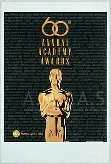 第60届奥斯卡颁奖典礼是美国电影艺术与科学学院旨在奖励1987年最优秀电影的一场晚会,于太平洋时区1988年4月11日下午18点(北美东部时区晚上21点)在美国加利福尼亚州洛杉矶的神殿礼堂举行,共计颁发了22座奥斯卡金像奖(也称学院奖)。晚会通过美国广播公司在美国直播,由小塞缪尔·戈尔德温担任制片人,马蒂·帕赛塔导演[2][3],男演员切维·切斯连续第二年担任主持人[4]。两周前的3月27日,雪莉·琼斯在加利福尼亚州比佛利山的比弗利希尔顿酒店主持颁发奥斯卡科技成果奖[5]。