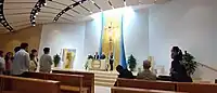 新聖堂位於新翼地庫,可容納約700人。於領洗池和祭台的上方設有金字塔天窗,以融入外界的天然光。