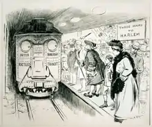 1902年4月,贝尔蒙特将公司重组为跨区捷运公司(IRT)作为地铁新线的运营公司,此后IRT于1903年4月1日承包经营曼哈顿铁路的4条高架铁路。[54]1904年10月27日,起于市政厅车站,终于145街车站的首条地铁线路西侧线正式通车。这是纽约市的第一条正式运营的地铁线路。[3][55]