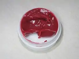 - 《外科正宗》裏的生肌玉紅膏配方:當歸60g、白芷15g、白蠟60g、輕粉12g、甘草36g、紫草6g、血竭12g、麻油600g。將當歸、白芷、紫草、甘草,入麻油內冷浸三日,慢火熬至枯色後過濾。將油再加熱後入血竭,完全溶解後再下白蠟,微熱攪拌至均勻。入小容器中稍微冷卻,將輕粉加入拌勻。完全冷卻後即得成品。[6]