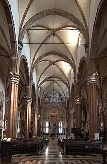 目前 内部的模样是15世纪装修的结果。正殿和走道用红色维罗纳大理石壁柱分隔。每侧的前三个小堂都是同一个风格,大多是文艺复兴时期维罗纳的艺术家的作品。