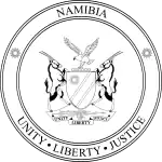 納米比亞國徽為一盾徽,上為國旗圖樣。護盾獸為代表勇氣、優雅、自豪的直角羚。地上有当地沙漠植物百歲蘭,象徵堅韌不屈的精神。盾上方有吼海雕,象徵領袖的遠見,其所站立的花環圖案為鑽石形,代表國家的礦產和傳統。飾帶書有國家格言“團體、自由、正義”。