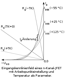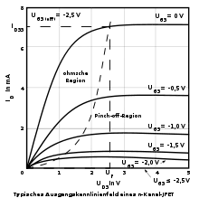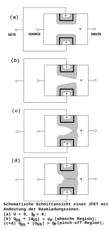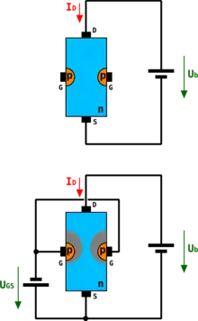 假如在栅极和源极之间施一负电压的话则閘源二极管之间的耗尽区更加扩大。沟道的宽度和长度均可以被改变[1][2][3]。这样一来可以达到控制效应,这个效应与双极性晶体管的原理类似。在输出特性曲线上可以看得出电流水平的部分的值变小。在这种情况下提高源漏电压也只能很小地改变漏电流。